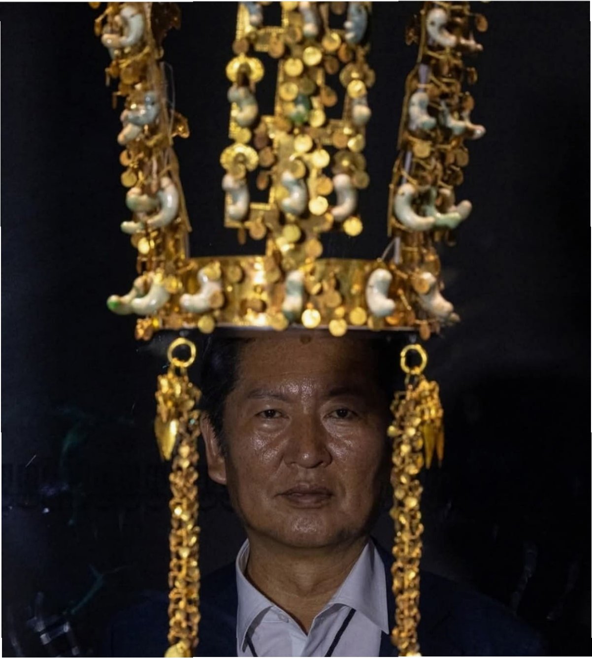 A.정청래 대표가 경주 방문 중 국립경주박물관에서 촬영한 사진으로, 마치 신라 시대 금관을 쓴 듯한 착시 효과를 주는 사진이었습니다.