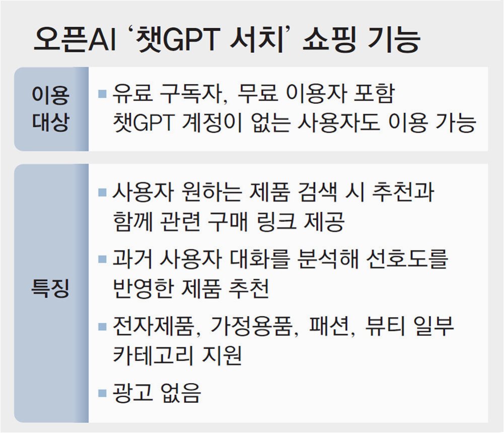 A.챗GPT 내에서 상품을 검색하고, 외부 사이트로 이동하지 않고 바로 결제할 수 있는 기능입니다. 엣시 및 쇼피파이에서 우선적으로 지원되며, 챗GPT 플러스, 프로, 무료 사용자 모두 이용 가능합니다.