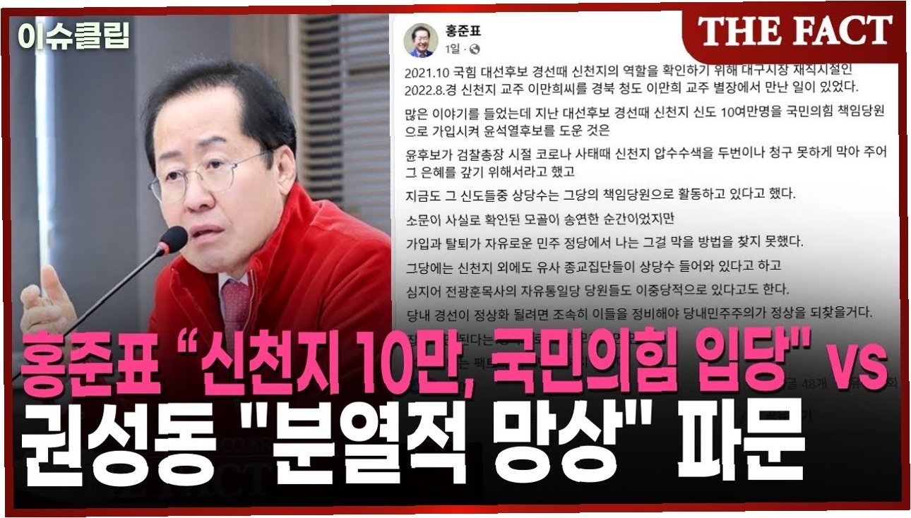 홍준표 전 시장의 주장에 따르면, 이만희 교주는 “신천지 신도 10여만 명을 국민의힘 책임당원으로 가입시켜 윤석열 후보를 도왔다”고 말했습니다. 이는 윤석열 후보가 검찰총장 시절 신천지 압수수색을 두 번이나 막아준 것에 대한 감사의 표시였다고 합니다. 홍 전 시장은 현재도 상당수의 신천지 신도들이 국민의힘 책임당원으로 활동하고 있다고 전했습니다.