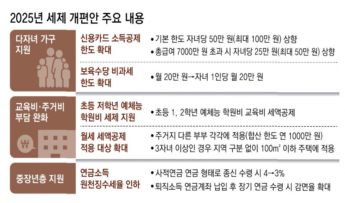 2025년부터 자녀 수에 따른 신용카드 소득공제 확대, 다자녀 가구 월세 지원, 대학생 자녀 교육비 공제, 고향사랑기부금 혜택 강화 등 다양한 세금 혜택이 제공됩니다. 이는 출산 및 양육 가구의 경제적 부담을 완화하고, 저출산 문제 해결에 기여할 것으로 보입니다.