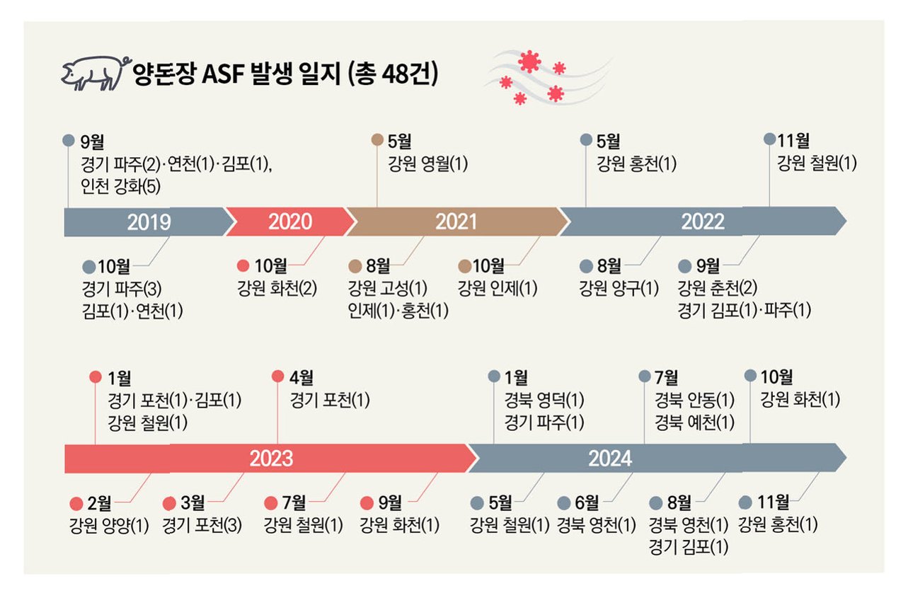 이번 ASF 발생은 지난 7월 경기 파주시 사례 이후 2개월 만에 추가로 발생한 사례로, 올해 들어 전국 다섯 번째 확진 사례입니다.